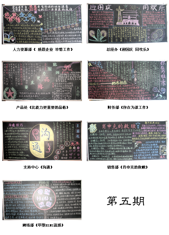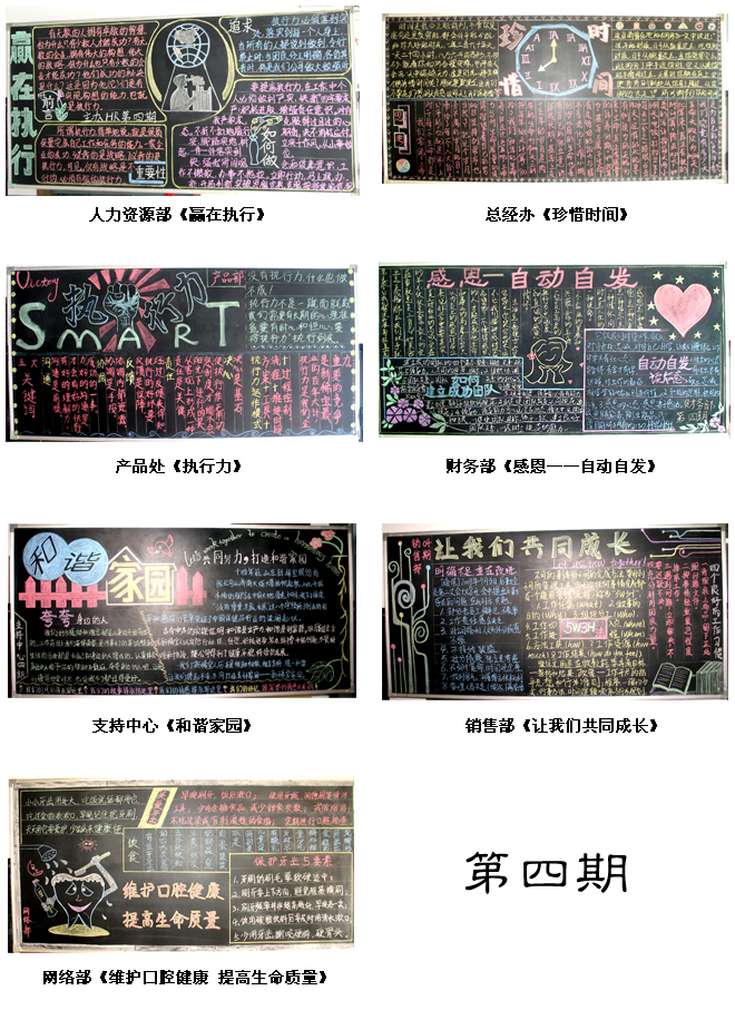 在黑板報制作過程中,各部門投入了極大的熱情,積極查找資料,充分發(fā)揮各自的優(yōu)勢和特長,巧妙設(shè)計版面,努力做到主題突出、內(nèi)容豐富、構(gòu)思巧妙、形式多樣、圖文并茂、精彩紛呈。 第四、五期黑板報整體上更是以內(nèi)容豐富、主題鮮明、形式新穎,受到大家的一致喜愛。
