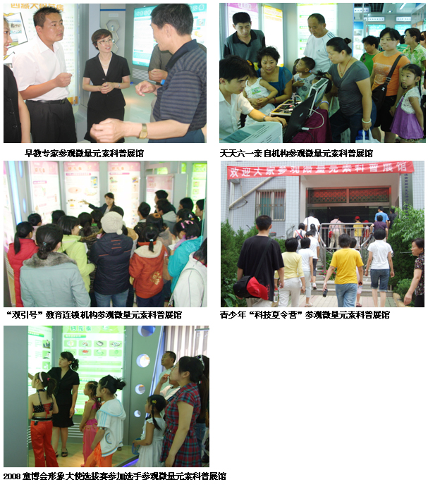 我企業(yè)投資建設(shè)了山東省乃至全國(guó)第一個(gè)微量元素科普展館,并免費(fèi)向社會(huì)開(kāi)放。展館內(nèi)圖文并茂、形象生動(dòng),解說(shuō)員向每一位來(lái)參觀的人講解微量元素科學(xué)的進(jìn)展,微量元素在人體中的重要作用,微量元素和人體的健康、亞健康、疾病、長(zhǎng)壽、智力及美容的關(guān)系,微量元素如何科學(xué)補(bǔ)充,等等。展館對(duì)外開(kāi)放1年多以來(lái),接待來(lái)賓上萬(wàn)人次,反映效果非常好,微量元素與健康的關(guān)系越來(lái)越被社會(huì)重視。