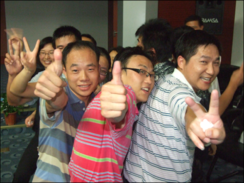 在講到“泛愛眾”這個章節(jié)時,任老師與大家分享了一個“同甘共苦”的互動游戲,他把現(xiàn)場人員分為12個組,每隊12至15人不等,大家并排站好,拼成一個緊湊的圓圈,每個隊員依次坐在后一位隊員的腿上,哪隊堅持的時間長哪隊就獲勝。開始時大家還感覺很輕松,隨著時間一分一秒的過去,疼痛感漸漸襲來,大家開始感覺體力不支,這時會議室的空調也停止運轉,七月的濟南,正是最熱的時候,不一會兒,大家就大汗淋漓。