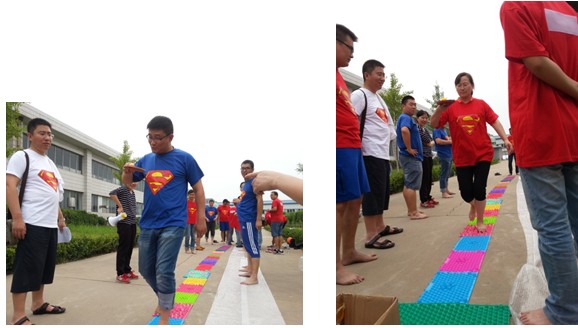 “心有靈犀”結(jié)束后,藍(lán)隊(duì)紅隊(duì)穿好隊(duì)服轉(zhuǎn)戰(zhàn)到戶外,大家的激情遠(yuǎn)遠(yuǎn)超過了戶外天氣的熱度。主持人剛剛講解完比賽規(guī)則,大家就投入到了比賽活動(dòng)中,一個(gè)個(gè)隊(duì)員光著腳板在指壓板上快速前進(jìn),手上還小心翼翼的用乒乓球拍端著乒乓球,眼睛目不轉(zhuǎn)睛的盯著球拍上的乒乓球,臉上用各種表情來表達(dá)腳板的感覺和對球拍上乒乓球的關(guān)注。每個(gè)隊(duì)員都成功的端著球走過了指壓板,大家熱烈地討論并分享著自己的感受。