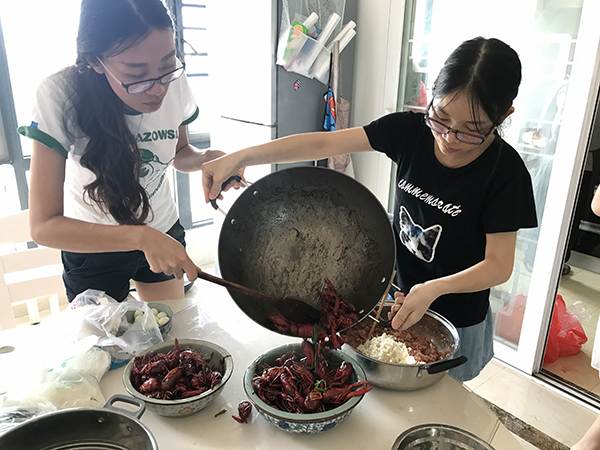 大廚們陸續(xù)到場,不一會廚房內(nèi)就已經(jīng)熱火朝天,洗菜、切菜,忙得不亦樂乎。很快的,第一道熱菜就下鍋了,第一道熱菜是小云做的十三香小龍蝦,只見她用刷子 把小龍蝦仔仔細細刷了一遍,最激動人心的就是下鍋的那一刻了,爆香蔥姜后再把小龍蝦倒進鍋里,頓時發(fā)出“呲啦”的聲音,快速翻炒小龍蝦,沒過多久就陣陣飄 香,小龍蝦的香味讓同事們的饞蟲都被勾出來了。