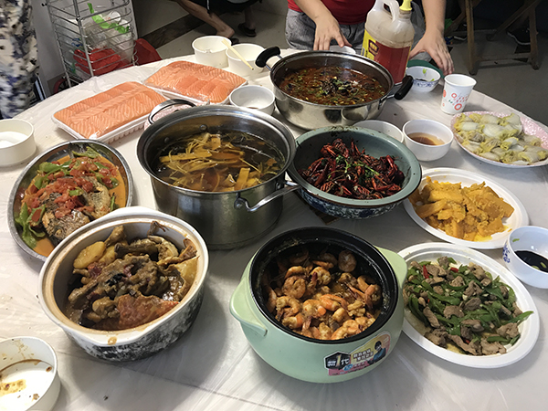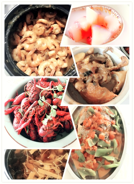 沒想到平時工作能力杠杠的同事們,做起菜來也絲毫不遜色。沒過多久菜已經(jīng)陸續(xù)上桌,有毛毛做的紅燒魚與水煮牛肉,米粒做的菜包釀、咸蛋炒南瓜;陶大神做的 佛跳墻、蟹黃煲、椰香蝦;潤姐的燒鴨、西芹紅椒炒白果、涼拌木耳;寧寧的炒花甲螺;振宇做的青椒炒肉;芳芳的芒果西米露。一大桌菜色香味俱全、品種多樣, 飯前涼菜、家常炒菜、營養(yǎng)豐盛的大菜以及飯后甜點應(yīng)有盡有。