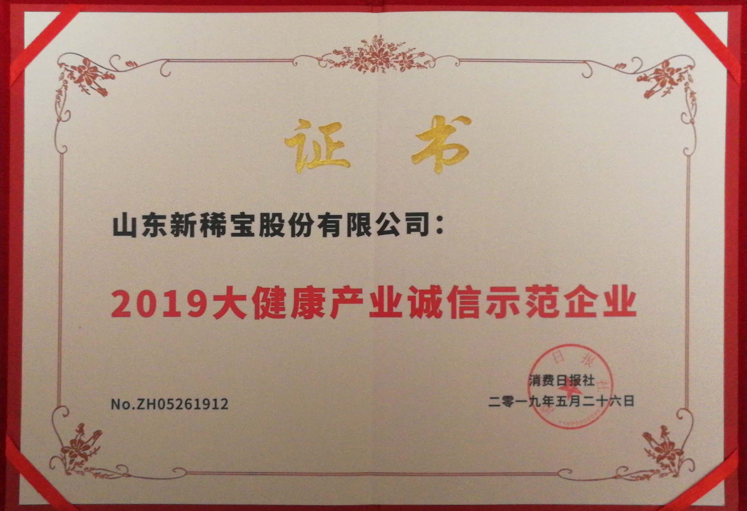 被消費(fèi)日?qǐng)?bào)社評(píng)為“2019大健康產(chǎn)業(yè)誠信示范企業(yè)”