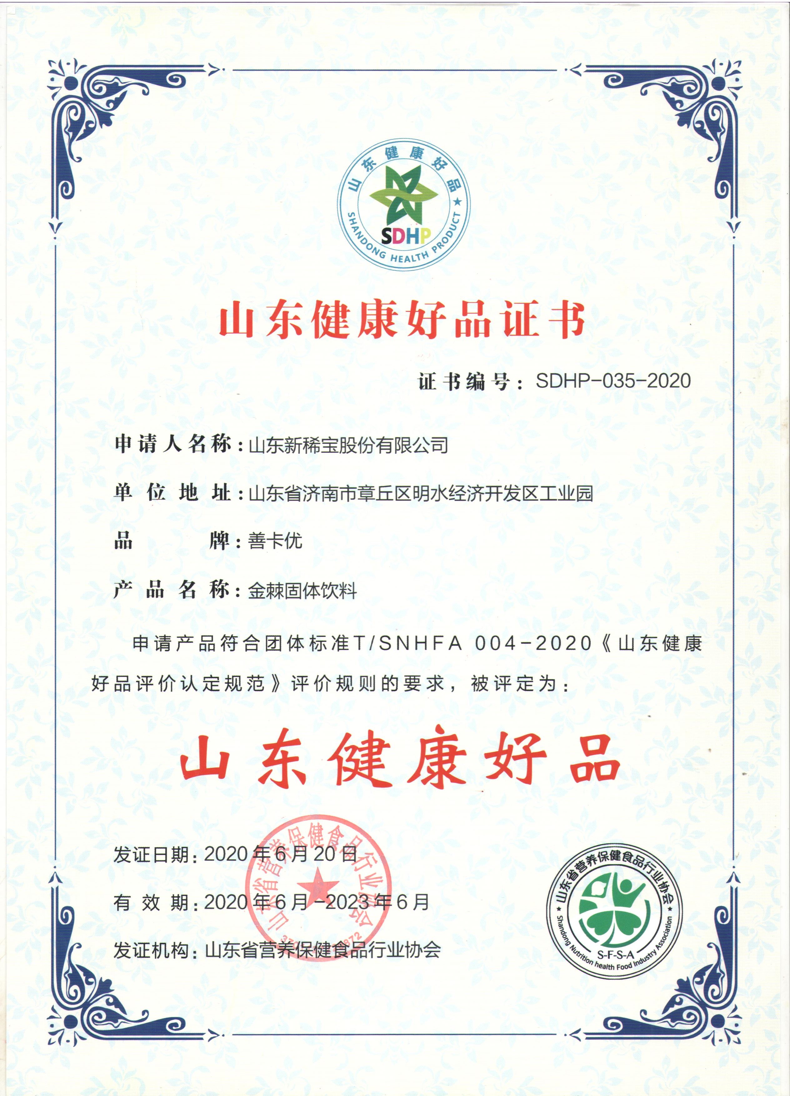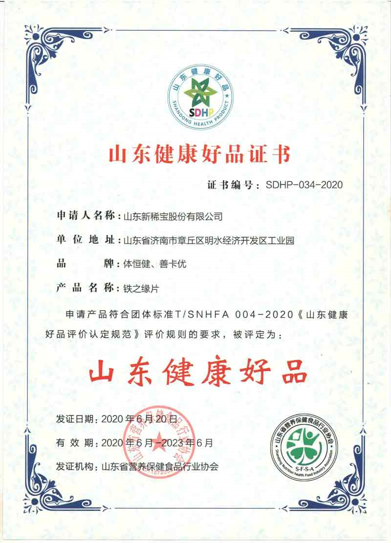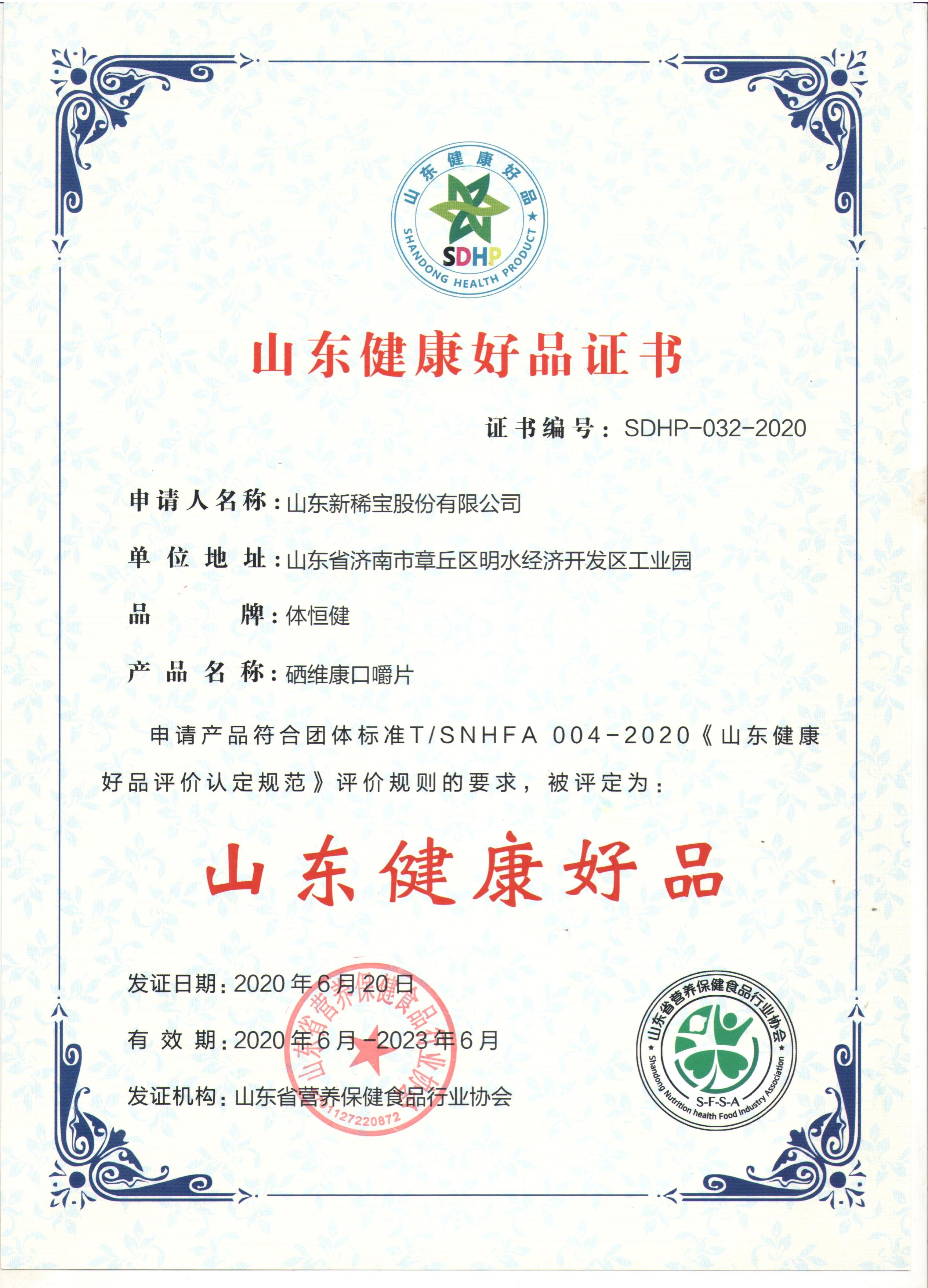 月鋅硒寶片、鐵之緣、硒維康口嚼片、育之緣口嚼片、金棘固體飲料五款產(chǎn)品獲得山東健康好品證書