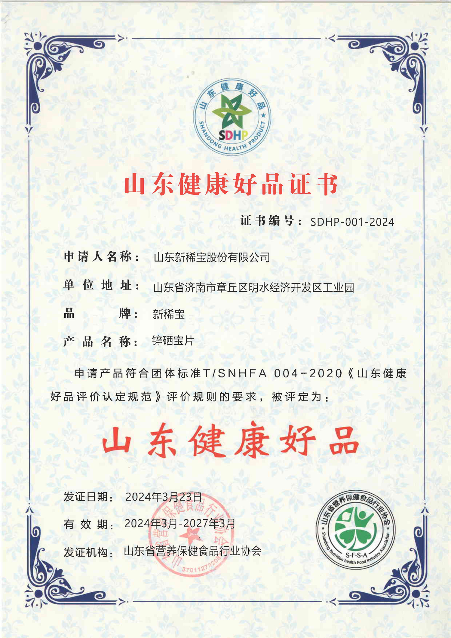 2024年3月23日,山東省營養(yǎng)健康產業(yè)高質量發(fā)展論壇在青島順利舉辦,會上公布了第二批山東健康好品獲獎名單。其中,新稀寶集團旗下產品“鋅硒寶片”被二次授予“山東健康好品”的稱號。